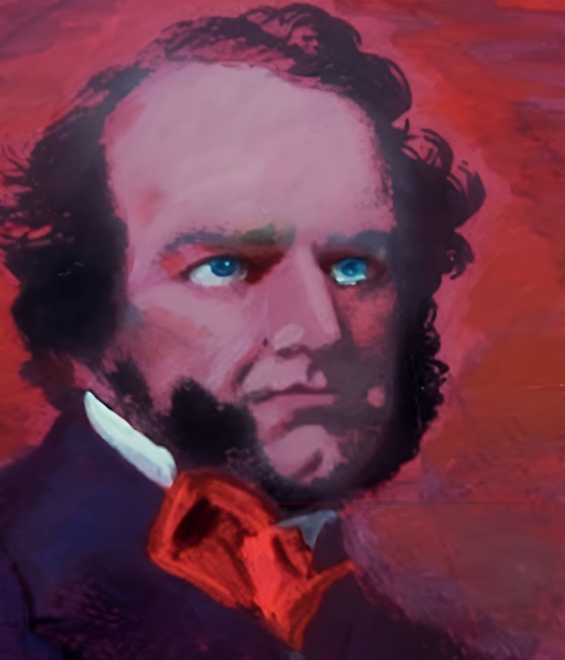 All of this added to my research and attempts to uncover past images of the great man. He couldn't pop round to my studio to sit for me, being otherwise engaged! I found around ten drawn illustrations of him and one daguerreotype from his late dotage, with others where he is unrecognisable, his face and head being almost entirely covered with white hair and dressed in unkempt clothing. The line illustrations I refer to are almost all different from one another in various ways, and some are so different that one wonders if it is the same person! Against this background, I worked from the couple of images that seemed most used in past reproductions, as those absorbed most into the national psyche of how he looked. I wanted to enlarge on the courage and formidable adversities he had to overcome in his lifetime and present an image in dramatic colour of his determination and success peering forward! An eternal image of human success, and what a success, over the innumerable obstacles life throws up at us!
